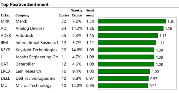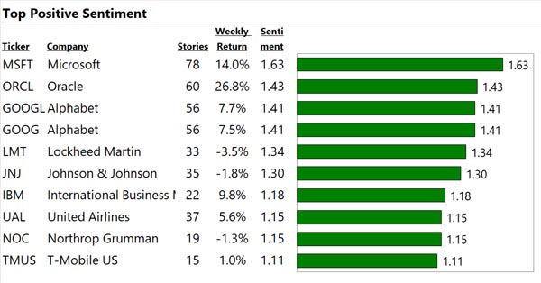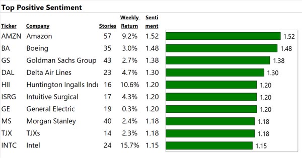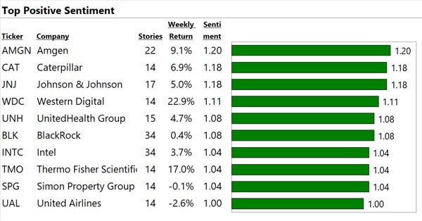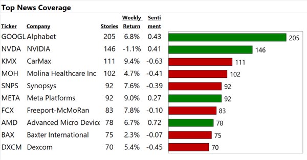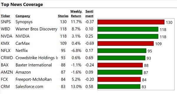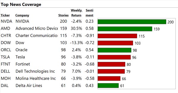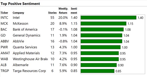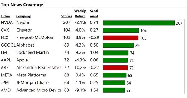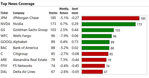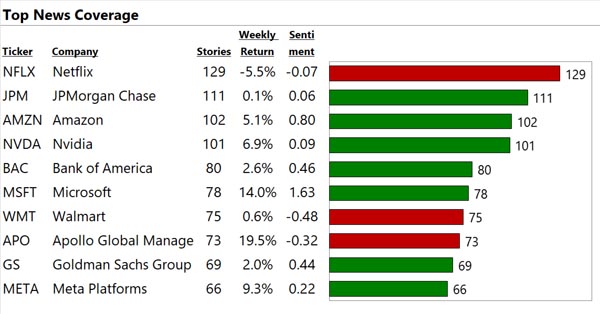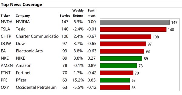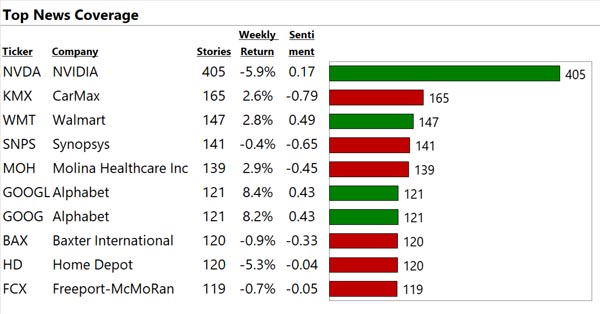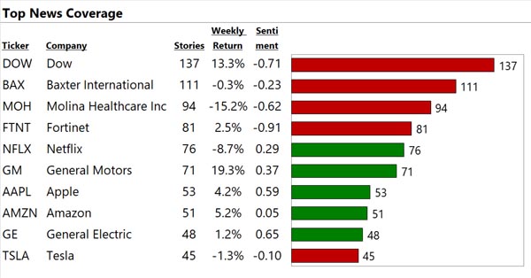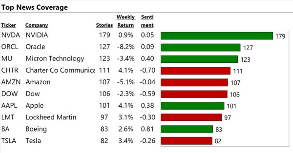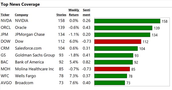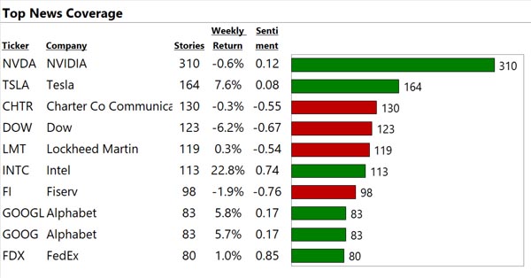 We analyze the world's financial text at big data scale. See below for our top 10 US large cap stocks with the most, best, and worst news. "Contact Us" to gain a true information edge and generate significant Alpha.