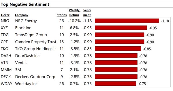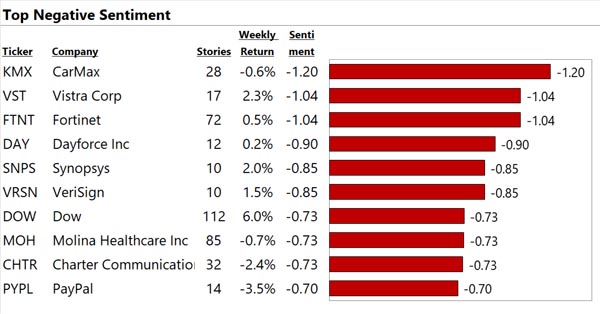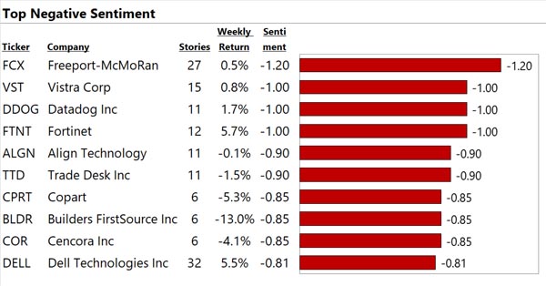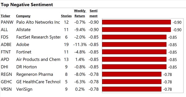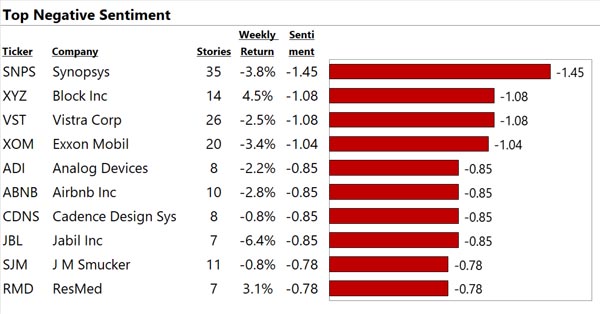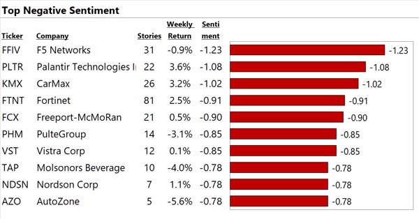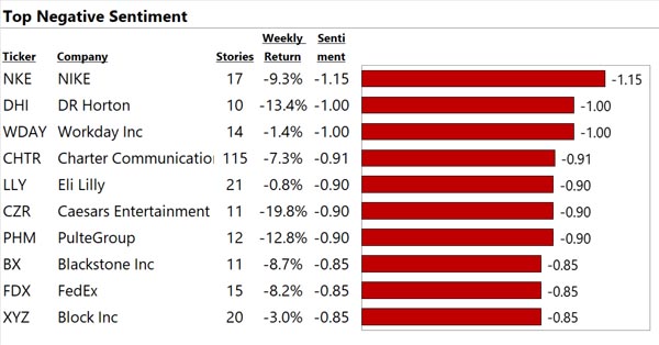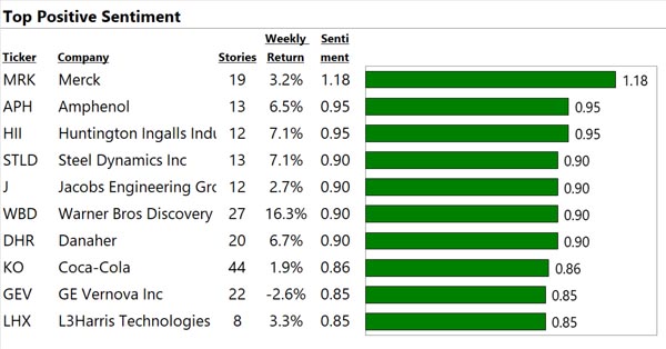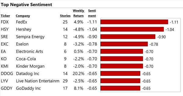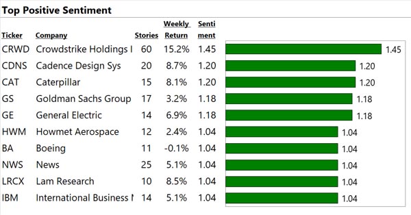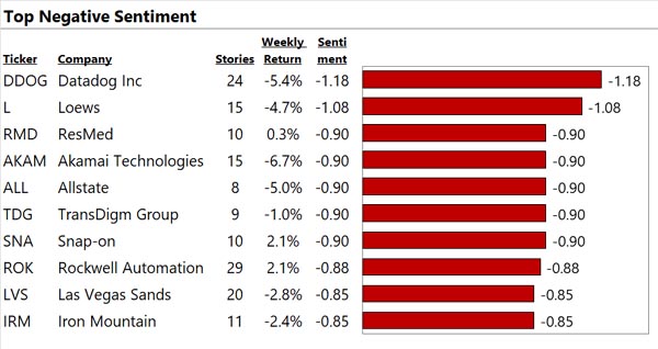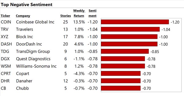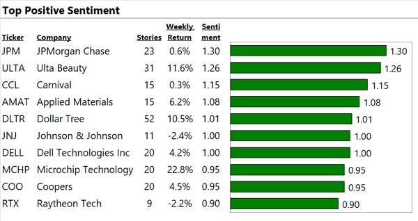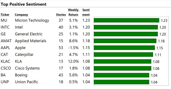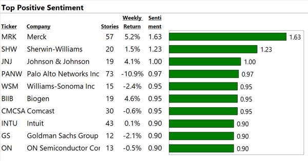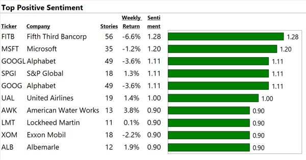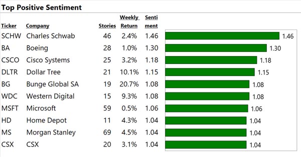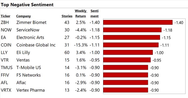 We analyze the world's financial text at big data scale. See below for our top 10 US large cap stocks with the most, best, and worst news. "Contact Us" to gain a true information edge and generate significant Alpha.